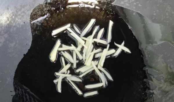 第四步:整片姜切成薄片,青蒜苗洗净撕去一层皮,蒜苗切成几小块,准备好榨菜丝和一些小菜,开始做这道炸肉丝。芥末芥末蒜苗。