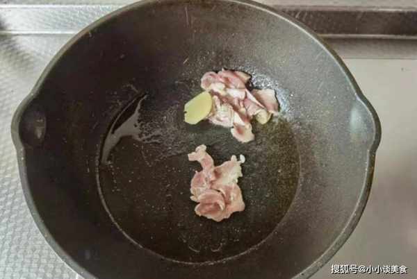 第四步:姜蒜切细丝,锅底放煎炸油,放入切好的姜丝,倒入肉片用小火炒至肉片慢慢炸熟。颜色是白色的。