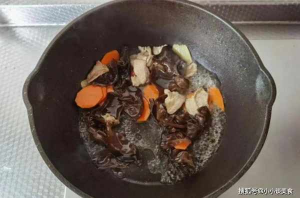 第五步:倒入黑蘑菇和胡萝卜片,快速搅拌片刻,锅内倒入足量的水,防止蘑菇涨起来。