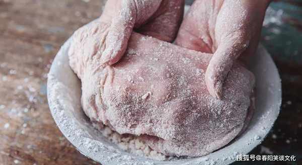 第二步:加入一些生粉或面粉,将五花肉表面抹平,清洗干净,重复几次,然后加入白醋,少许盐,浸泡约20分钟,将五花肉清洗干净备用(用淀粉和生粉,特别是因为淀粉和面粉有很强的吸附性能,吸附油脂和污垢,这样五花肉吃起来更舒服)