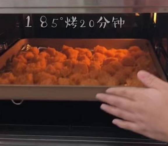 5、放入烤盘再放进预热好的烤箱,185℃烤20分钟,外脆里嫩的鸡米花就做好啦!