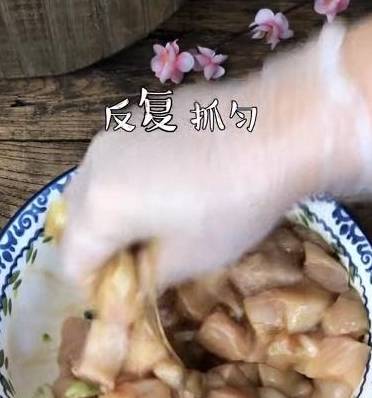 2、鸡块放入碗中,加葱姜、1勺耗油、2勺生抽、半勺胡椒粉、1勺蜂蜜、适量食盐、一个鸡蛋清、1勺玉米淀粉,然后戴上一次性手套反复抓匀,尽量抓的久一点,会更入味