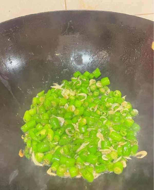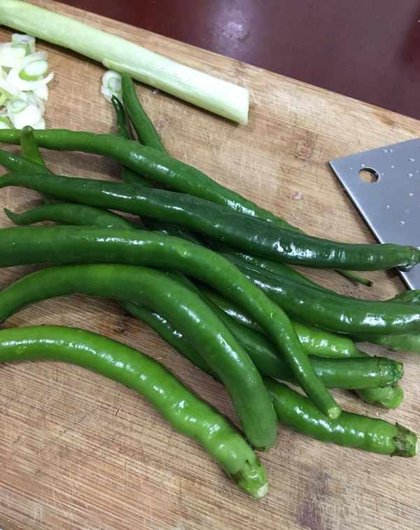 选料:买280克左右的杭椒(杭椒的一个品种,杭椒大小尖,不怎么辣,经常用来做配菜),土鸡蛋4个,高60克。-优质虾皮左右,温水少许,水淀粉适量,白醋几滴,盐适量,鸡精半匙,白胡椒粉少许,香油和其他香料。