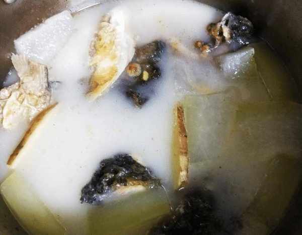 第五步:等冬瓜变透明,鱼头营养在汤里煮熟。尝尝鱼汤的咸淡,加点鲜味,加点胡椒粉和葱花。