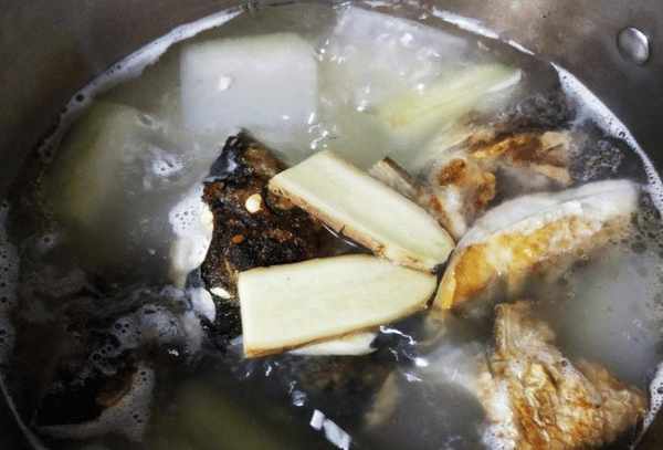 第四步:将炸好的鱼头放入汤锅中,用小火将鱼汤煮至呈乳白色,汤中盐不要放太多,一茶匙即可,加少许鸡精煮熟大约10分钟。