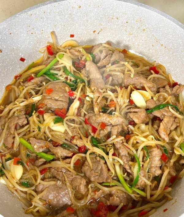 第九步:加入盐和鸡渣,快速翻炒几下,收汁出锅。这些韭菜豆芽炒牛排就做好了。