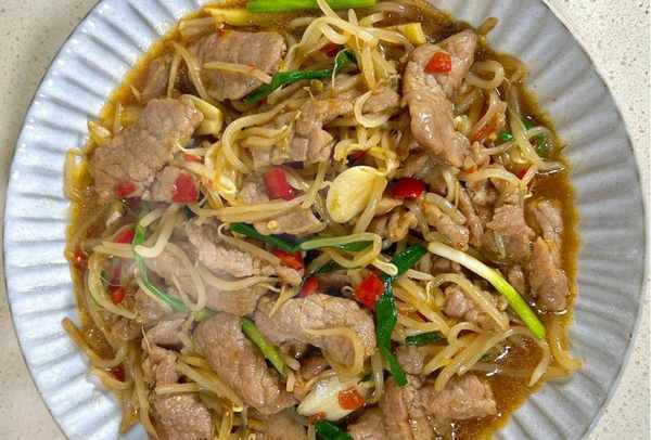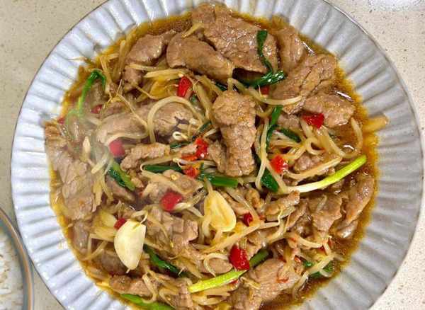 详情配料:买一小把豆芽(豆芽就是豆芽,分为黄豆芽和绿豆芽,豆芽热量低,植物纤维高,味道很清甜爽口,荤素均可,我家喜欢凉拌炒),选250克新鲜牛肉(牛肉是很受欢迎的肉类,比猪肉贵,肉很嫩,里脊肉可以用来炒牛肉条或者牛肉片)、酱油几勺、蚝油勺、胡椒粉适量、料酒一勺半、生粉少许、食用油少许、白糖一勺、嫩韭菜少许、大蒜头一个、少许剁椒,几片姜和其他调料。