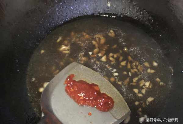第八步:锅底加入花生油,小火烧热,加入蒜末爆香,加入事先调好的酱汁翻炒片刻。