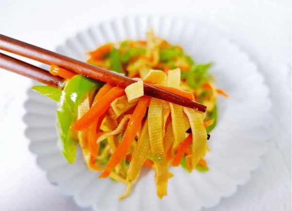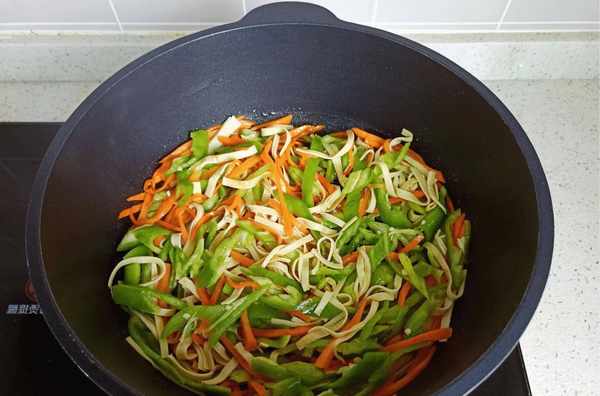配料表:买三个辣椒(也可以选择红辣椒和青辣椒,建议选皮薄厚的,皮要饱满,手感软硬,这样的辣椒不会很辣,有的营养价值高),买千张(约180克,冷水略泡),买胡萝卜,生抽和蚝油,糖小,黑黑。胡椒粉、玉米少许、香油和色拉油少许、盐适量、水少许等。