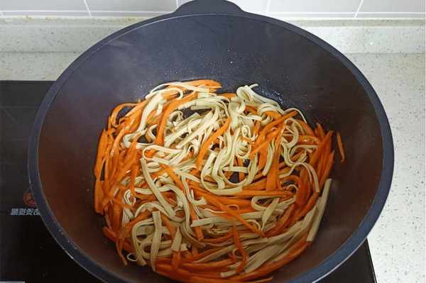 第四步:锅里放少许油,烧开食用油,放入切好的胡萝卜翻炒,待切好的胡萝卜炸断。
