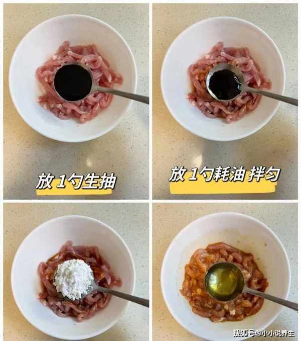 2:先将里脊洗净。里脊要顺着纹路切,切成几薄片。将剁碎的猪肉放入容器中,加入少许料酒,原酱油搅匀,加入姜片,加入蚝油和盐,加入一勺生粉,用手反复抓匀。