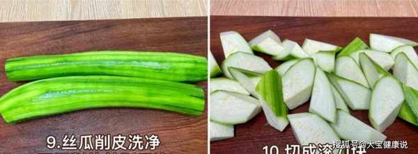 第三:剥去丝瓜的外皮,剪掉多余的部分,将丝瓜切成几片热板,以免丝瓜氧化,将丝瓜用盐水浸泡,捞出调水。