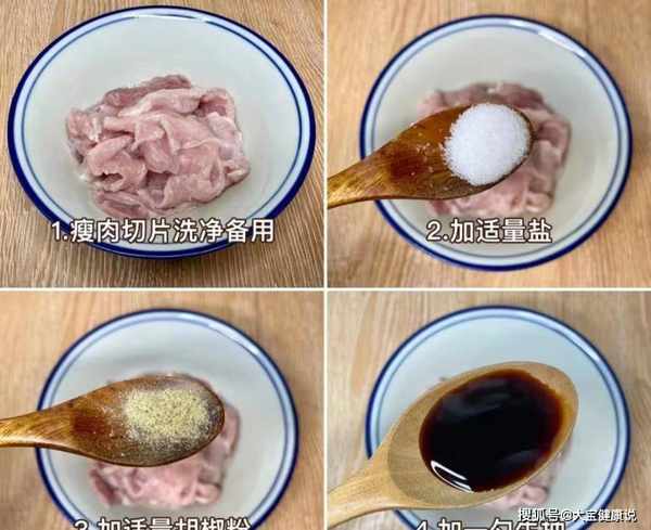 二、猪肉提前腌好,加适量盐,加少许料酒去腥,加半勺胡椒粉,加少许生抽,裹少许生粉,充分抓匀,将肉片放置半分钟。大约一个小时后,肉片又嫩又好吃。