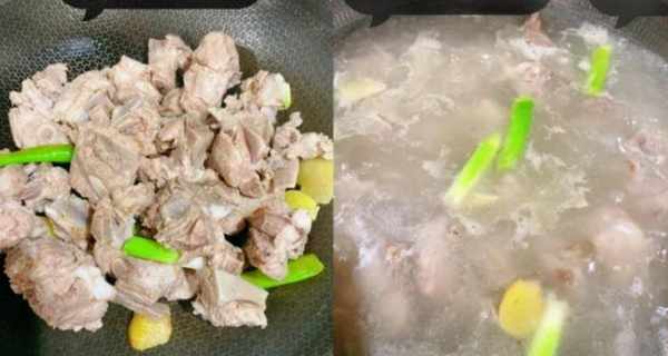 3:提前将猪骨剁成若干块状,猪骨块冷水浸泡一会儿,冲洗干净,锅中放入猪骨块,加上冷水足量,丢入一些姜片和葱段,大火煮几分钟,去掉猪骨的腥味,捞出用温水冲洗干净。