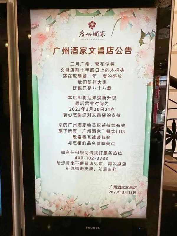 3月13日,广州酒家官微发布推文,预告2023年3月20日,文昌店将暂别老友记,正式启动全面升级改造计划。前台工作人员透露:“文昌店的改造升级计划停业18个月,20日是最后一天营业,最近都有不少街坊来打卡。”