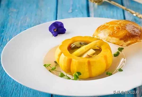 鲜春笋,羊肚菌,冬瓜,菊瓜盅,三色堇,香菜,油酥皮,浓汤,南瓜汁,生粉。