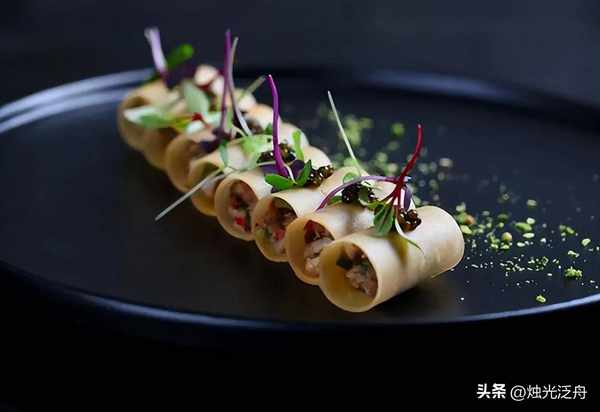 蟹、春卷皮、鱼子酱、柠檬皮屑、柠檬汁、沙拉酱、芥末。