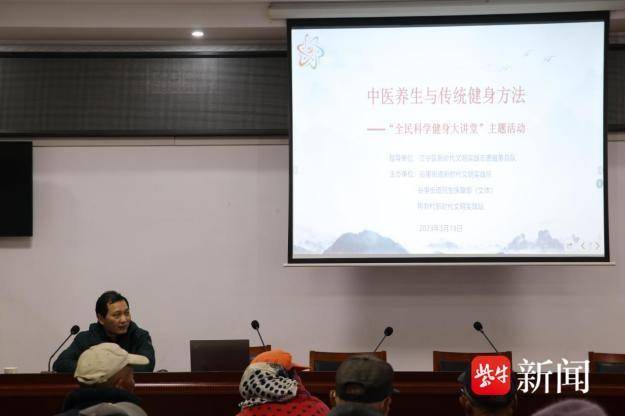 扬子晚报网3月20日讯(记者 梅建明)为普及中医养生知识,实现全民科学健身的目标,3月18日,由南京市江宁区文旅局主办,谷里街道民生保障部(文体)及荆刘村新时代文明实践站承办的“江宁区‘服务群众 你点我送’体育健身进社区”暨“中医养生与传统健身方法——全民科学健身文化大讲堂”活动在荆刘村市民学校举办。此次活动因涉及健康养生,吸引了辖区数十名中老年人参加。