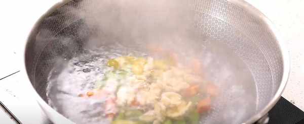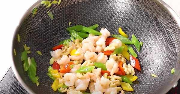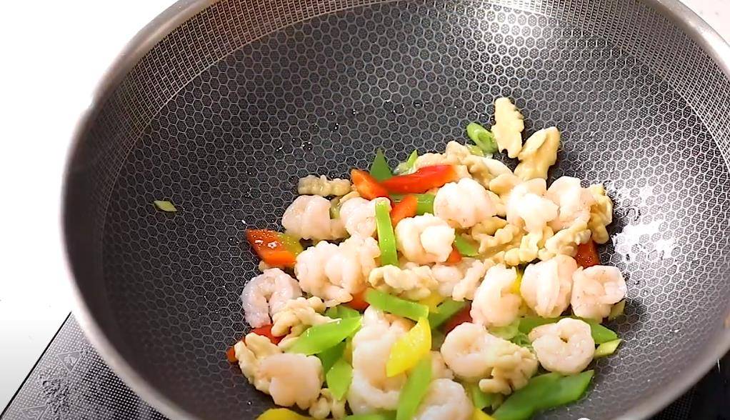 第5步、开始起锅烧水,水开后,放入青红椒,莴笋,核桃仁,稍微的煮一下,再放入虾仁,虾仁煮的时间不要超过5秒,然后捞出备用。