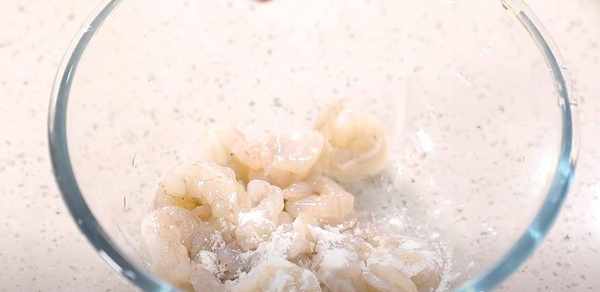 第4步、把泡发好的虾仁,用厨房用纸吸干水分,然后进行上浆,先加入少许的食盐进行抓拌均匀,再加入少许的淀粉抓拌均匀就可以了。