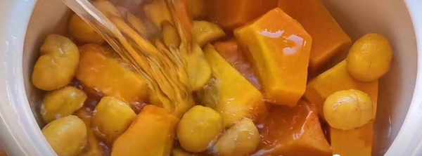 第2步、然后准备一个砂锅,把板栗和南瓜放入,再加入适量的清水,先大火将它烧开。
