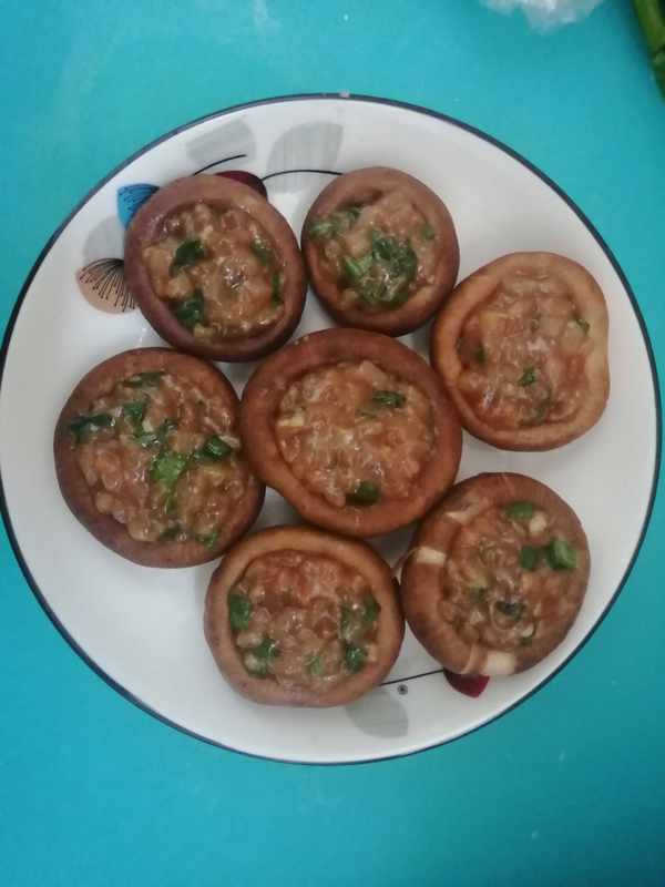炸香菇酿肉:准备食材:香菇,猪肉,葱,姜,蒜,鸡蛋,香油,生抽。