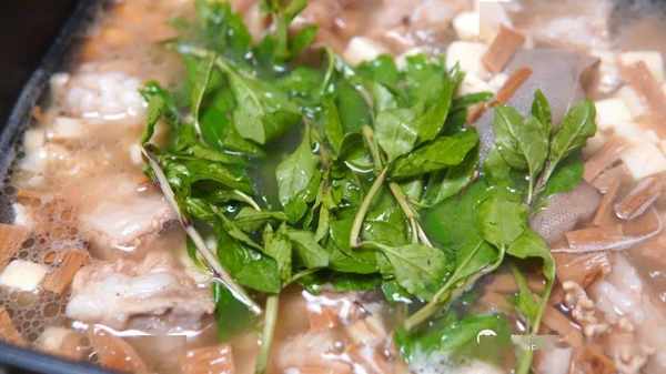 排骨煮好后把料包里的菜干扔下锅煮五分钟,之后就能烫着喜欢的菜吃了,我青菜用的是枸杞叶,微苦的味道很搭锅里的药味。