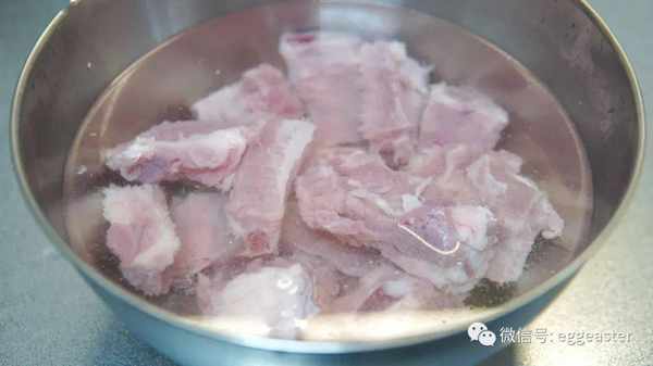 依旧是抓细几次表面去掉细碎骨片,再浸泡2小时以上,泡去血水杂质的做法。用浸泡而不是焯水去腥味的做法,适合用在清炖排骨类的做法里,肉味骨香能保留得更好。