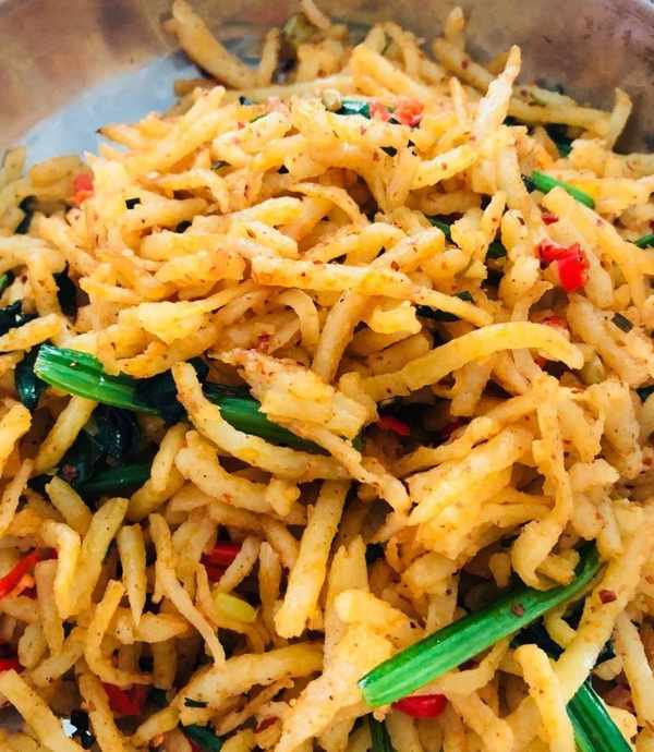 5、朝鲜蓟Tchacha:朝鲜蓟是土豆,Tchacha朝鲜蓟是陕西的特色美食。金黄色的土豆略带油光,土豆的香气四溢。咬一口,既有薯条的口感和嚼劲,又有碎牛肉和红辣椒的鲜香,好吃极了。