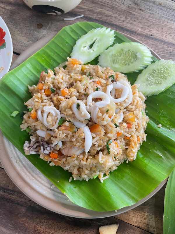 我点了水果沙拉、海鲜炒饭、生腌米粉、辣汤,特别好吃!
