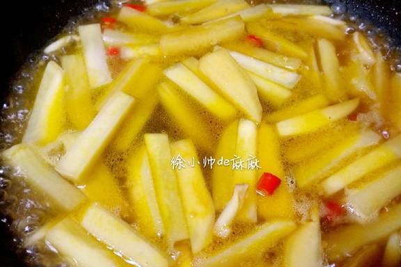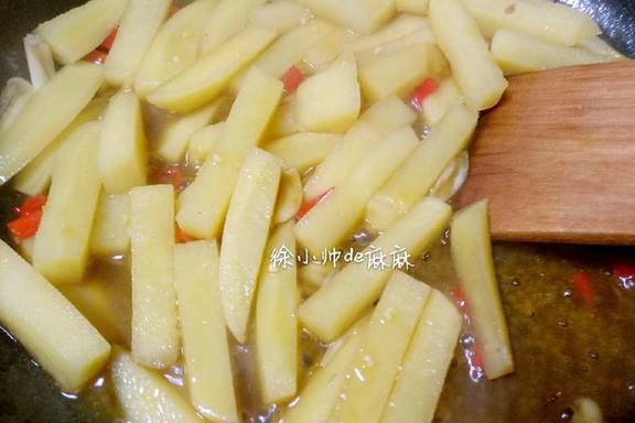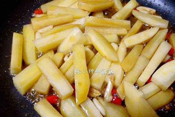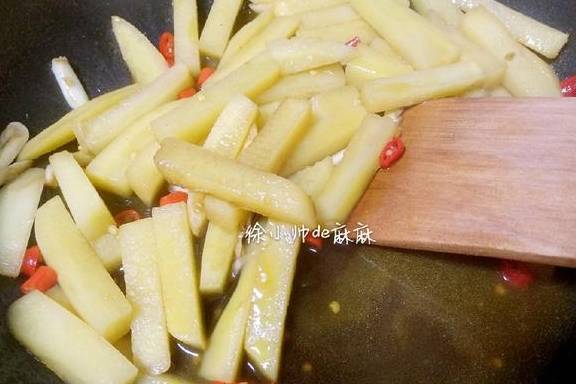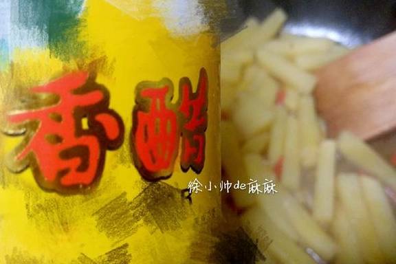 3、倒入没过土豆条的热水或者高汤,大火煮沸,中小火焖煮3-5分钟,看到剩下少许汤汁的时候倒入一点醋,大火收汁即可。