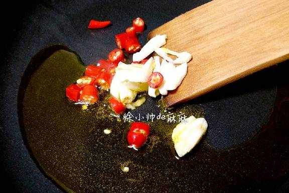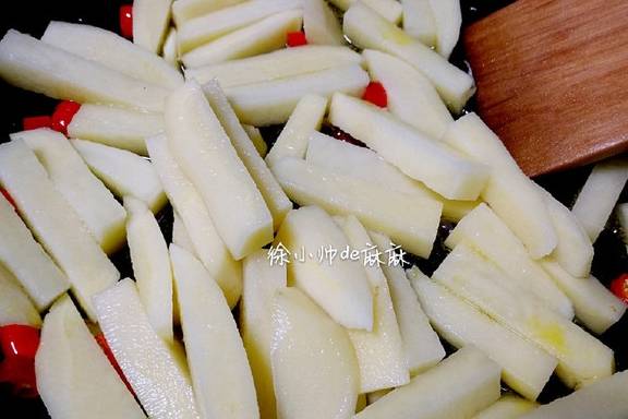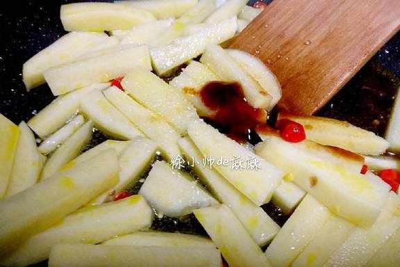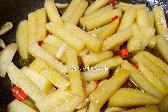 2、热锅热油先将小米辣和蒜末爆香,倒入土豆条,翻炒均匀。添加作料:盐、生抽、糖、胡椒粉、蚝油,将土豆条翻炒均匀。
