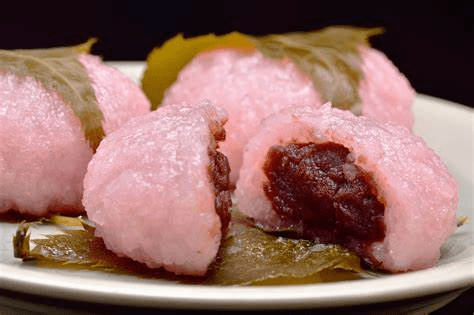 关西风的樱饼“道明寺”是将糯米磨成粗粉后蒸熟,再裹住红豆馅,外面裹上一片同样用盐腌制后的樱花叶。