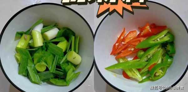 第四步:把青蒜苗的黄叶捏掉,青蒜苗去根,切成几小段,两种辣椒洗净斜切段,姜蒜切小块切片,准备培根和一些小菜,开始做蒜蓉沙拉炒培根。