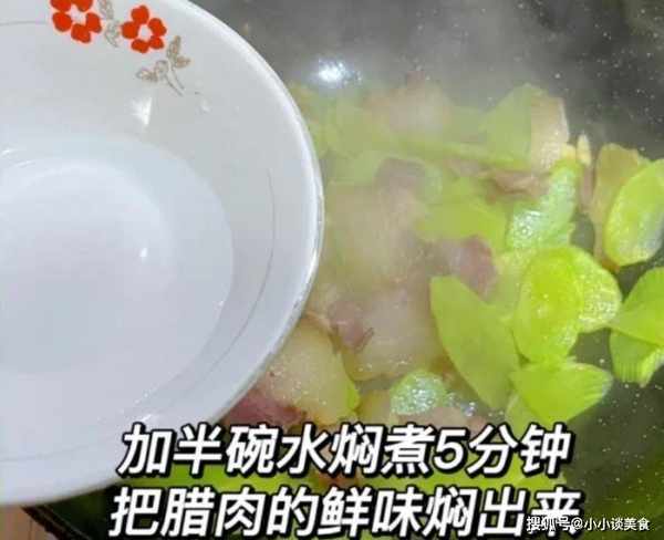 第六步:倒入一些生菜片,加半碗水小火炖一会,盖上锅盖煮5分钟,再下培根文火炖至入味。