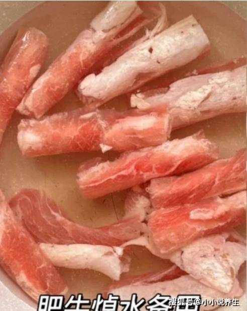 第三步:将肥牛卷冷水擀开,锅中烧开半锅水,倒入肥牛卷,加入两勺料酒,大火煮一会,焯水后用冷水冲洗干净,沥干水分,放在备用盘子上。