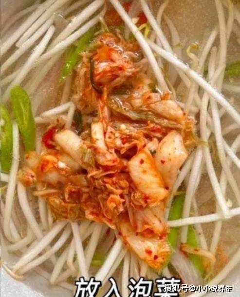 第六步:加入几片大蒜,倒入一些豆芽搅拌至光滑,加入适量的水煮沸,加入韩国泡菜,翻动材料,盖上锅盖煮一会。