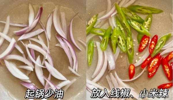 第五步:锅底加少许油,加入洋葱炒香,加入小米椒和青椒,快速翻炒15秒。