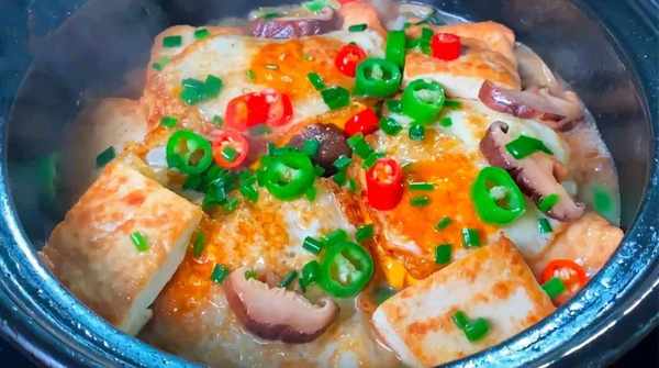 4、砂锅中加少许的油,油热后下入葱姜蒜,炒出香味。然后下入香菇炒出香味。把白菜,豆腐也倒进来,把荷包蛋放在上面,倒入调好的料汁,撒上青线椒、小米椒。盖上盖子,炖煮六分钟左右,就可以了。