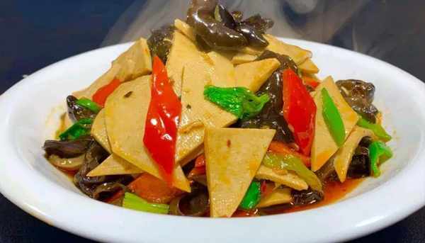 4、油热之后倒入葱蒜片炒香,放入一勺豆瓣酱炒出红油,然后加入黑木耳,豆皮翻炒开来,把料汁倒进来,翻炒均匀,下入青红椒炒至断生。最后再放入香菜,快速的翻炒几下,豆皮炒黑木耳就做好了。
