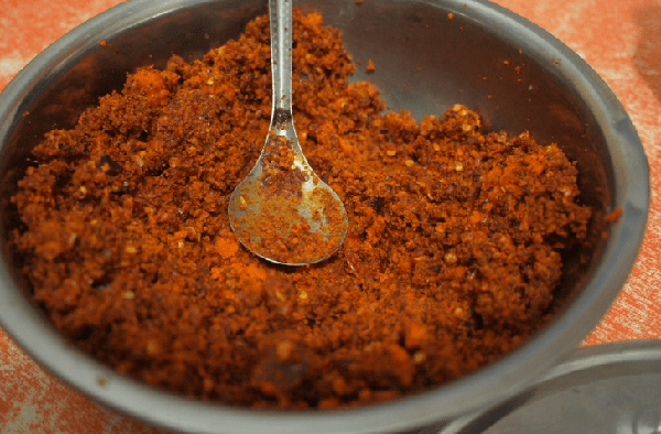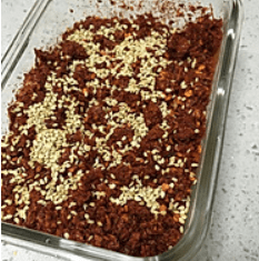 1.辣椒面用开水拌拌,大概湿湿潮潮就可以;撒白芝麻和一点盐。