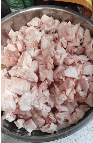 1:将买来的羊板油全部分切成均匀的小块(如买来的羊油不是太干净最好切完清洗干净)方便熬油;