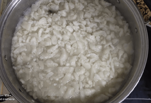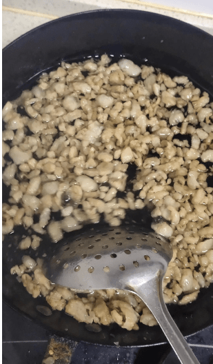 4.待羊油块榨干后立即捞出避免长时间会出焦干味影响清油味道,(此处榨干的羊油块可以在其他容器沥干残存的油份,可以斩碎最后放进成品里,亦可做包子材料)。
