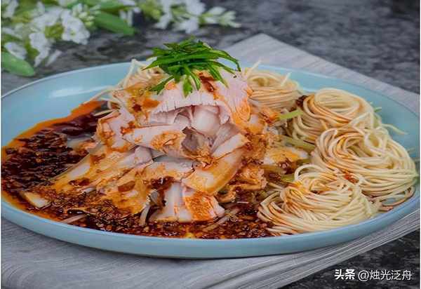 1、把猪二刀肉烧毛后治净,下入加有姜块、葱结、盐的水锅,小火煮熟后,捞起来切成薄片。另把绿豆芽下入沸水锅里烫熟,捞起来冷却;把紫甘蓝、青红椒分别切成丝,均待用。