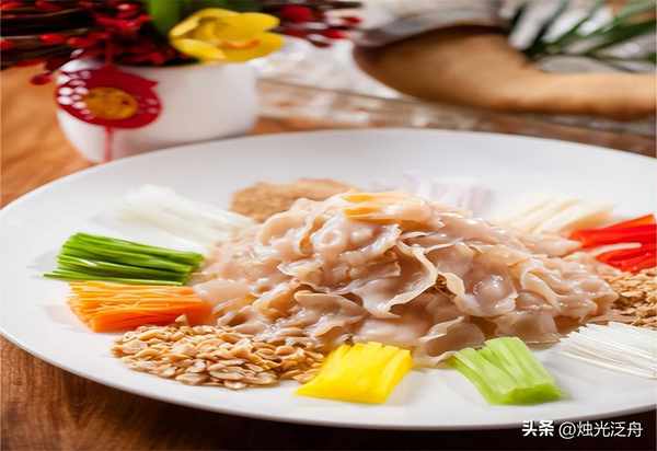4、将浸熟过冷后的象拔蚌捞出,撕下表面的膜,吸干水分,用片刀片薄片,铺在炸芋丝上。