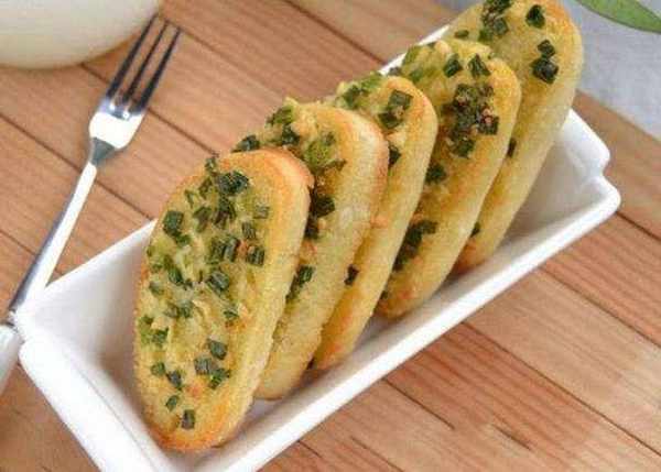 4.将馒头切成三片,抹上调好的蒜泥酱。