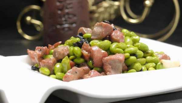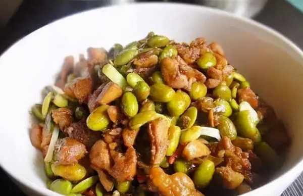 用料: 毛豆、鸡胸肉、盐、料酒、生抽、土豆淀粉、豆豉香辣酱;