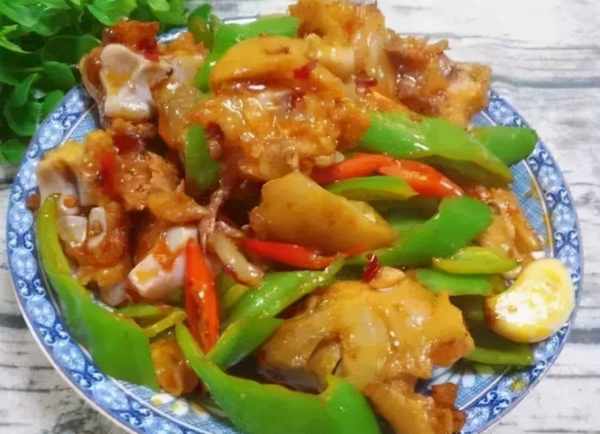 2、加郫县豆瓣酱,小火炒出红油,下猪蹄,煸炒一会儿,加生抽、料酒,翻炒几下,下辣椒,翻炒至断生加少许盐,炒匀即可。