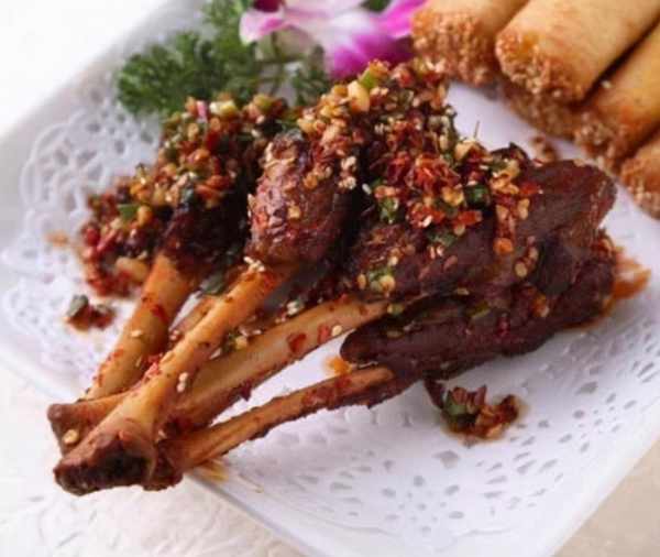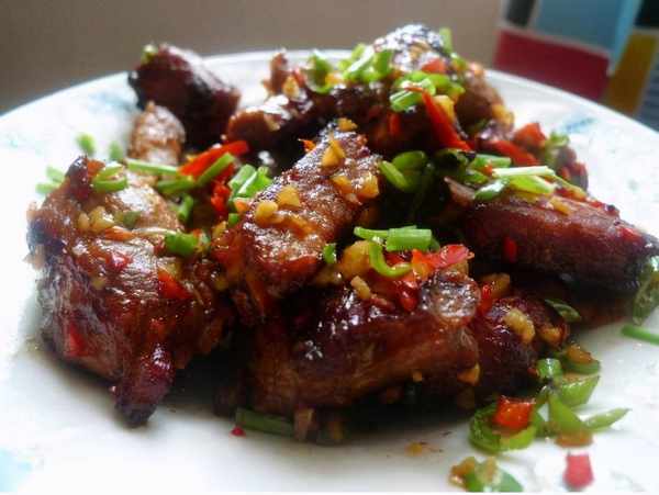 3、锅里少许余油,爆香蒜茸、豆豉碎、红椒碎,下寸骨翻炒,倒入蒸寸骨的汁,收汁撒孜然、鸡精拌匀撒葱花即可。