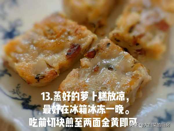12.蒸好的萝卜糕放凉,最好放入冰箱冰冻一晚。食用前切小块,小火煎至两面金黄即可。